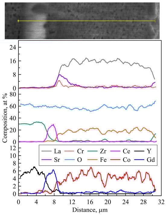 Such effects were not typical for Cells 1 and 2; however, some crack-like defects were observed for the former (Figure 11). Tangential cracks, or delamination, are responsible for developing both ohmic and polarization resistance because they effectively decrease the active surface of the cell. Originating from excessive pressure of the oxygen [], delamination did not demonstrate a tendency to fade in the galvanostatic mode, which explains the steady, almost linear rise in the ohmic resistance of Cells 1 and 3 and the polarization resistance of Cell 1 (Figure 6). However, the behavior of the of Cell 3 is more complicated and can be explained as the result of the chemical interaction of the LSCF with steam, coupled with the de-mixing and segregation of Sr. While SEM-EDS analysis of Cells 1 and 2 did not reveal any sufficient deviation in chemical composition (Figure 12 and Figure 13), in the case of Cell 3, the situation seems totally different (Figure 14). Cell 3 demonstrated sufficient migration of Sr to the surface of the GDC; however, this migration did not lead to observable penetration through the protective barrier and the formation of strontium zirconate, as might be expected in the case of poorly-made cells [,]. The migration of the strontium led to an alteration of the chemical composition along the depth of the anode layer, which resulted in the decomposition of the perovskite structure of the LSCF with the formation of a mixture of complex oxides. This makes the phase composition of the steam-exposed LSCF complicated for analysis (Figure 15). While the XRD of the pristine LSCF electrode only has reflexes, which correspond to the structure of the rhombohedral perovskite with space group R-3c and copper support, the spectrum of the Cell 3 anode has sufficiently more lines, the most prominent of which are labeled with “?”. Nominally smaller additional peaks can be attributed to the reflexes of the (La,Sr)FeO4- or LaSr3(Fe,Co)O10-based Ruddlesden–Popper phases [,,]; however, the intensity of the labeled peaks is much higher than can be expected from an undistorted structure. Reflexes labeled with “?” are compatible with the spinel structure of Co2FeO4 or CoFe2O4 [], the first of which is known as a product of the Cr poisoning of the LSCF []. Proper deciphering of the phase composition looks problematic due to a lack of well-formed structures and the non-uniform distribution of the cations in the products of the LSCF–steam interaction. The Sr-enriched layer also traps chromium compounds (Figure 14), and the source of the volatile chromia can be found in the steel elements of the housing, which are produced from chromium-alloyed ferritic steel (Crofer 22 APU []). However, in cases where O2 or N2 were used as the ASG, no evidence of Cr contamination was detected, despite the fact that the LSCF electrode did not demonstrate strong stability against Cr poisoning []. This observation is in good agreement with the known acidity of the CrVI compounds and the presence of the acid-like volatile Cr hydroxides in the H2O-containing oxidative atmospheres over Cr-based materials []. Acidic CrOx(OH)y species were trapped by the relatively basic Sr-enriched compounds. It is worth underlining that no particular evidence of the excessive corrosion of the housing was detected, although the steam–oxygen mixture offered better conditions for Cr volatilization from the scale.