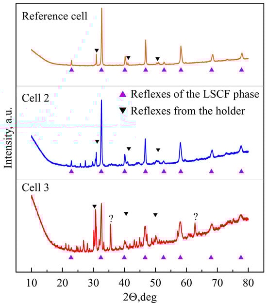 XRD of Cell 2, Cell 3, and reference pristine cell with LSCF electrode. The symbol “?” denotes significant reflexes of the novel phase (see text).