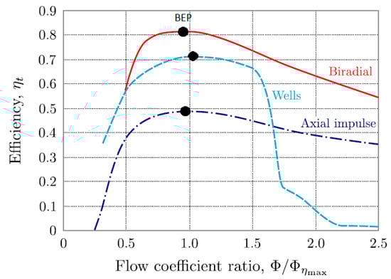 Compared efficiency ηt of the biradial, Wells and axial flow impulse (fixed guide vanes) turbines versus flow rate coefficient ϕ/ϕηmax, where ϕηmax is the flow rate coefficient at the point of maximum efficiency (BEP) for each turbine [].