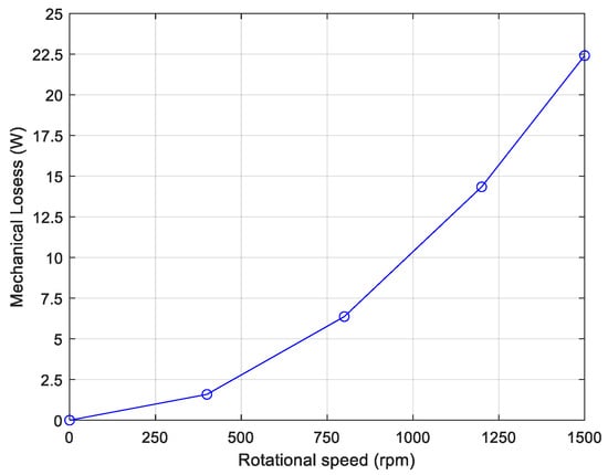 Mechanical losses depend on construction variables. Friction losses depend on the type and shape of the bearings, lubrication, load and rotational speed, while ventilation losses depend on the ventilation method, cooling medium, pressure and flow []. The calculation of these losses requires constructive information not usually obtained from manufacturers, but most components depend on the square of rotational speed [].