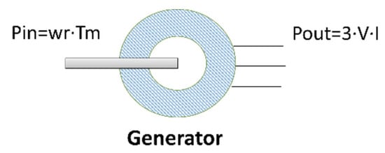 The objective is to obtain a surface with two inputs, speed and torque (w and T) and one output (efficiency). The efficiency map will be obtained through the execution of a controlled test battery on the generator. Figure 9 shows the power balance of the electrical generator under test. Mechanical input power will depend on the drive torque and rotational speed, while electrical output power or useful power will depend on the voltage (imposed by the power converter to create the magnetic field) and the currents (imposed by the power converter to extract electrical power and control the generator speed).