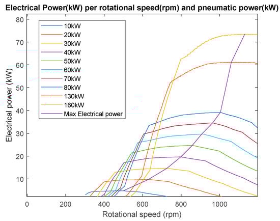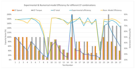 Considering the procedure of generator loss estimation developed in Section 5, a numerical model was built to obtain the overall efficiency at different operation levels. The results represented in Figure 11 show how, despite certain differences in the model output with respect to the experimental results, the numerical model significantly follows the results of the real tests.