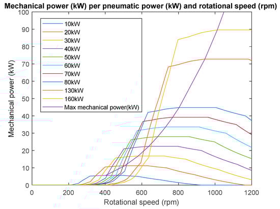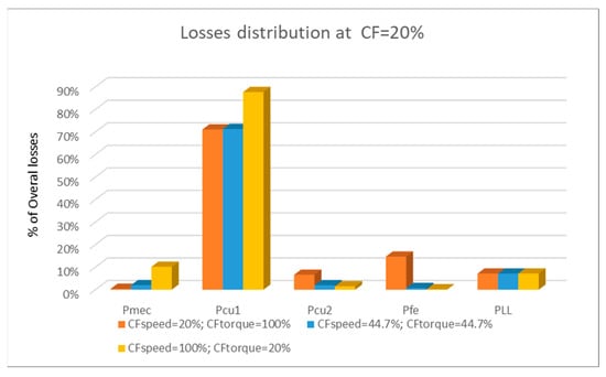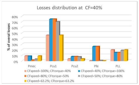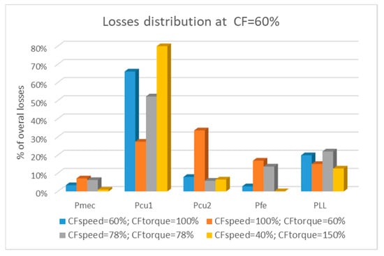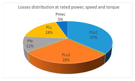 As explained in Section 5, and are stator related losses and and are rotor losses. Mechanical losses represent a low percentage of the total losses. This is common in standard-speed machines, while in high-speed machines these represent the largest loss component []. See Figure 13, Figure 14, Figure 15 and Figure 16.