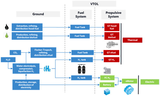 Since the path to low-carbon energy for air mobility induces low-yield energy vectors, and since the limited resources already reveal some tension regarding biomass supplies for biofuels [8,9], this study reviews a combination of the most cited energy vectors based on electricity with the most studied propulsive energy concept for VTOL.