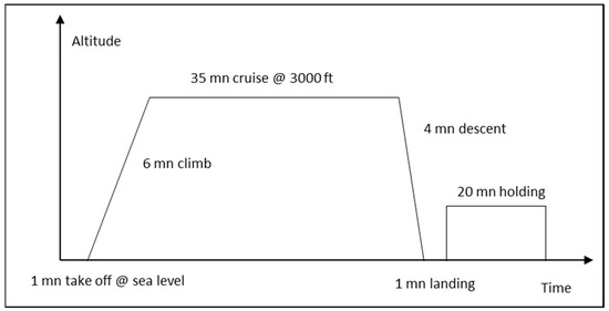Although the range of VTOL aircraft is often in excess of 300 nm, and typical missions often exceed this range between refueling, the 80 nm limit was set to take into account the possibility of introducing BE, as some potential air taxi missions are envisaged in the future with BE [18]. The crew is limited to one pilot, and the altitude is up to 4000 feet. A typical mission before refueling is around 45 min of flight time, as shown in Figure 2 above. However efficient it may be, a VTOL aircraft must continually fight gravity and will always consume more energy than a fixed-wing aircraft with a similar payload and range.