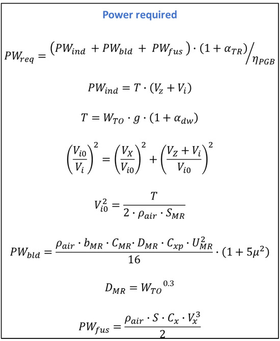 In our approach, we need to determine the power required at the main gearbox input to calculate the aircraft performance and ability to perform the mission. No modifications are assumed on the aircraft and a standard configuration comprising a large main rotor and a tail rotor to counteract the main rotor torque is used. The modelling is based on two well-known principles: the Froude–Rankine theory and the statistical design method for VTOL, here in the range of 1500 to 3000 kg, as proposed by A.Tremolet in “Numerical models and methods for conceptual studies of rotary-wing aircraft” [19]. The performance equations are described in Figure 3 below.
