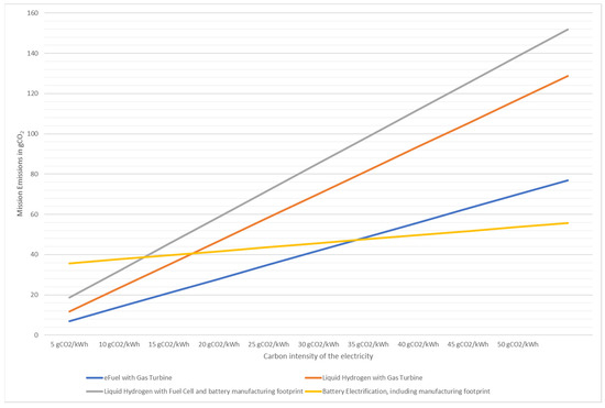 The energy required to fulfill the considered mission is first expressed in the units of the energy carrier before being translated into kWh at the well, the electricity grid, and its carbon intensity (CI), being the central focus of our analysis. Electricity is used either for direct charging, for liquified hydrogen (LH2) production through water electrolysis or for eFuel conversion using the Fischer–Tropsch process, which requires hydrogen and carbon dioxide. The results are then finally converted to CO2 emissions and direct energy cost to fulfill the mission.