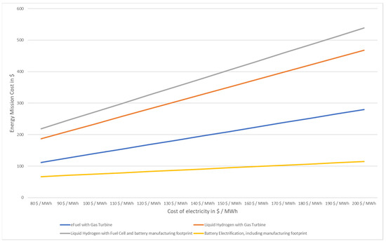 Whatever the price of electricity, battery electrification is always the cheapest option while a VTOL aircraft using LH2 either with a gas turbine or a fuel cell is always the most expensive option.