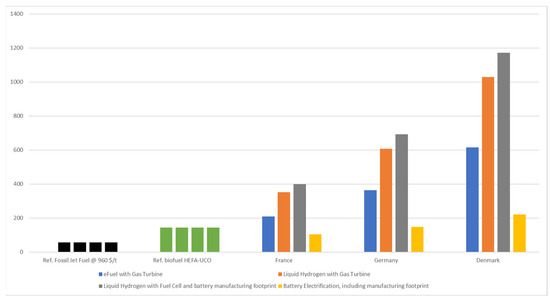 In Figure 8 we apply the price of electricity (EUR/kWh) of three European countries, using data from Statista [44] for the second semester of 2022: EUR 150, 260 and 440 per MWh in France, Germany and Denmark, respectively. We introduced the cost of fossil fuel and the cost of the most common biofuel (HEFA-UCO) [4] for comparison.