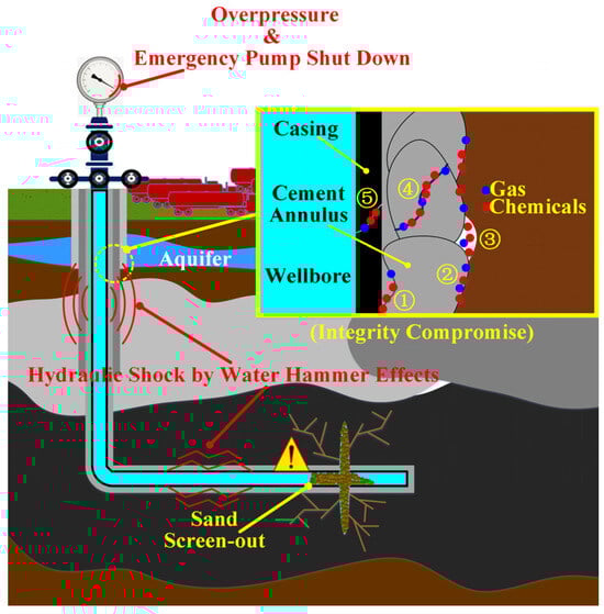 Initial efforts focused on detecting the migration of underground materials around fractured wells. Focused studies then noted that the key pathways were potential flaws in the casing and cement sheathing due to the quality of well completion and their routine failure during their service lives [5,16]. However, recent observations indicate that largely routine incidents (mainly sand screen-out) during fracturing also affect well integrity [19,20,21]. Sand screen-out often causes a sudden pressure jump that may exceed the capacity of the wellbore or wellhead equipment, which may deform the casing and compromise wellbore integrity [21]. An emergency pump-rate shut-down is usually performed to relieve the building pressure, which, in turn, may cause severe vibration and damage to the casing and cement annulus due to water-hammer effects [19,20]. These mechanical processes are graphically represented in Figure 1. Material leakages may occur through ① flaws between the cement and the casing, ②③ flaws and gaps between the cement and the formation, ④ cracked cement, and ⑤ deformed casing [5,22]. Thus, compromised wells can generate hyperchannels for the migration of underground materials. A significant breach in the casing may transmit pressure along the outer cement annulus and up to the above-ground wellhead. This has been observed as a common phenomenon in 30%~66% of fractured wells in the Changning–Weiyuan and Weirong areas of the Sichuan Basin, China [21,23], and in 6.3% (more than 500 wells) of fractured wells between 2005 and 2013 in the Marcellus shale in the United States [24]. Less perceptible damage may be manifest as late failures and risks to the environment over the well’s lifetime.