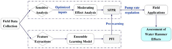 The integrated strategy is proposed based on two hypotheses. (i) Determining elements hypotheses: the pump rate, fracture volume/capacity, and proppant accumulation are proposed as the determining elements contributing to screen-out, according to their significance in hydraulic fracturing [33,34,35,36]. The mechanism of screen-out is presumed to result from parameter mismatch among the determining elements [37]. (ii) Linear-correlation hypothesis: the development of fracture networks during proppant injection is ignored when manually labeling the original data, based on which the authors assume that the probability of screen-out has a linear relationship with the injected volume of proppant under constant pump rate, and that the PFI (proppant filling index) has a linear correlation with the ratio of injected proppant volume and the total proppant volume when screen-out occurs. A data-driven workflow is built, based on the hypotheses, for real-time monitoring and regulation and the assessment of water-hammer effects, as shown in Figure 2.