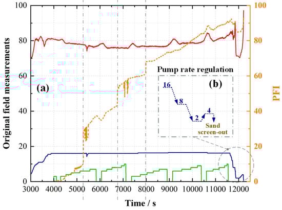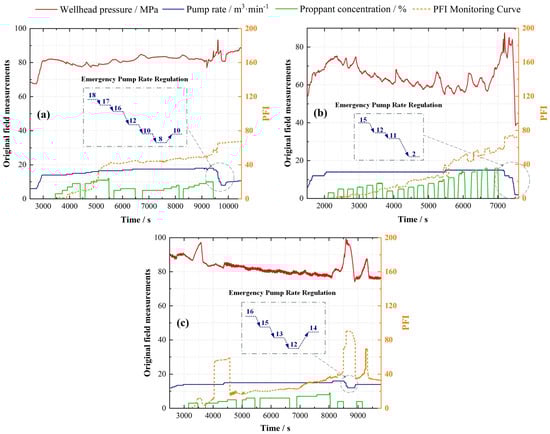 Three field cases are presented to deploy the PFI monitoring and SFPR regulation, as shown in Figure 4. The deep analyses of the PFI evolutions are explained in our previous study [32]. Generally, the sign of sand screen-out (encountering rapid or vertical increases in wellhead pressures and PFI curves) emerged in the three cases. A stepwise strategy for pump-rate regulation was applied to reduce the pump rate down to the range of the SFPR (between 5 and 10 m3/min), as shown in Figure 4. In Case A, the pump rate was reduced stepwise from 18 m3/min down to 8 m3/min, and then a pump rate of 10 m3/min was re-established for the following injection (Figure 4a). In Case B, the pump rate was reduced to 2 m3/min to terminate the fracturing operation (Figure 4b). In Case C, the pump rate was reduced and then maintained at ~12 m3/min because of the high proppant concentration and long stage of proppant slug, requiring a relatively high pump rate for the proppant transport. The pressure also decreased at ~12 m3/min and remained safe when the pump rate was rebuilt up to ~14 m3/min (Figure 4c).