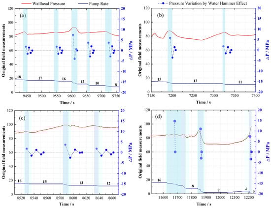 The estimated impulsive pressures from water-hammer effects in (a) Case A, (b) Case B, (c) Case C, and (d) Case D. Numbers above the navy curve on the bottom denote values of pump rate. The scattering dash-point curve in the middle is the pressure surge and variations by water-hammer effects.