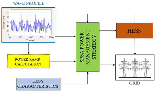 A dynamic model was developed in the MATLAB/Simulink environment to study and analyze the instantaneous power interactions among the WEC, the HESS, and the grid. This was to assess the performance of the SPSA power management strategy in terms of the power-smoothing effect towards the grid. The time step of the simulations was set as equal to 1 s. Figure 2 illustrates the model schematic layout, consisting of the following: