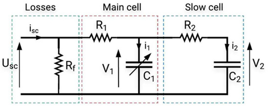On the other hand, the “slow cell” branch defines the internal energy distribution at the end of the charge or discharge process (range of minutes). The parallel resistance defines the leakage current when the SC is in stand-by mode (102 kΩ). The voltage relative to the “slow cell” branch is calculated by Equation (19):