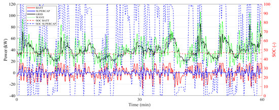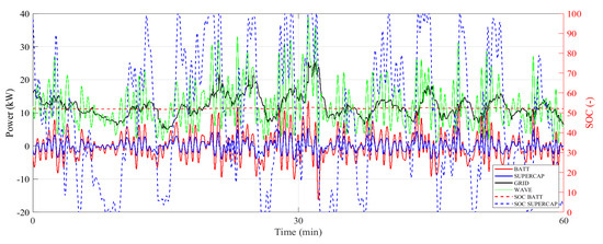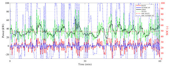 One-hour simulation instantaneous parameters relating to day 5 (site 3) for battery (power—red solid line, SoC—red dotted line), supercapacitor (power—blue solid line, SoC—blue dotted line), grid power (black solid line), and wave power generation (green solid line). Battery and supercapacitor negative power values correspond to discharge, while positive values correspond to charge.