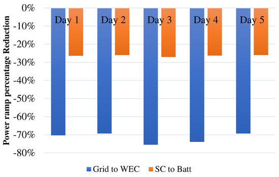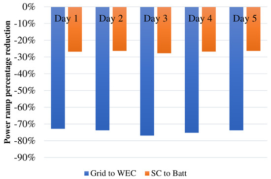 Assessment of grid power ramp reduction with respect to wave generation and battery power ramp reduction due to the presence of the supercapacitor for all the days at site 2.