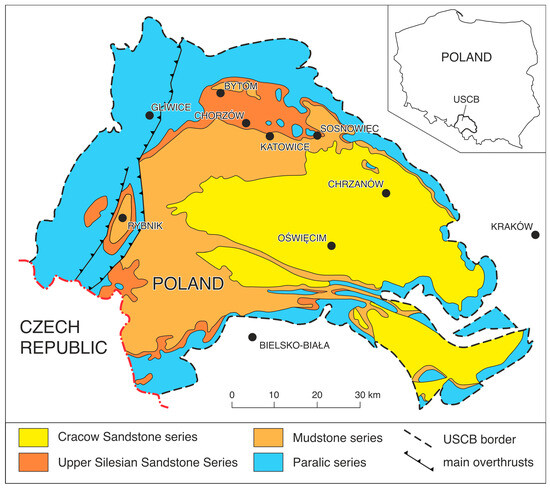 In the profile of the coal-bearing Carboniferous formation of the USCB, a distinct bipartition is apparent. The older part is formed by lagoon and wetland paralic sediments, while the younger part consists of continental sediments. The paralic formations are clastic rocks with insets of marine sediments [42]. The USCB continental sedimentation consists of three sedimentary series. It begins with the Upper Silesian sandstone series, composed of coarse-grained sediments (sandstones and conglomerates). The second unit is a mudstone series, represented by mudstone and claystone [43]. The final continental productive Carboniferous sediments consist of a Cracovian sandstone series, formed by coarse-grained sediments, such as sandstones and conglomerates. The total thickness of the coal-bearing sediments in the USCB is 8500 m [44].