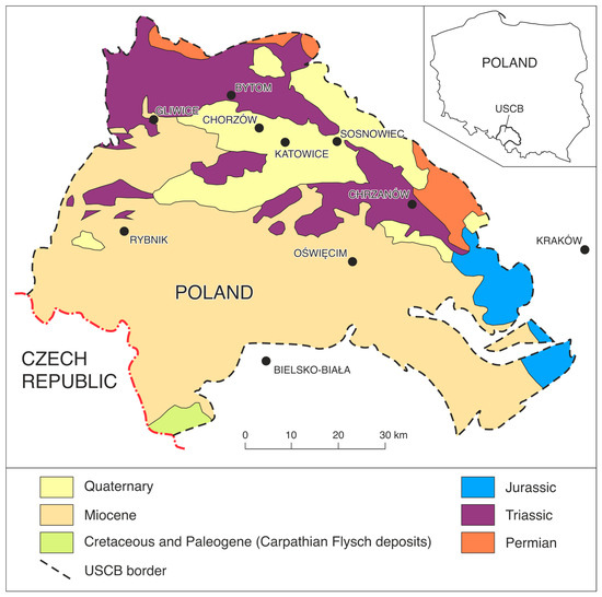 The oldest rocks in the overburden of the productive Carboniferous formation in the USCB are Permian sediments composed of calcareous conglomerates, melaphyrs, porphyrs, red sandstones, and clays. They fill depressions in the Carboniferous formation and are covered by Triassic and Jurassic sediments. The Triassic is developed in the bottom part as poorly consolidated sandstones and gravelly deposits, transitioning upwards into the marls and dolomites of the Rhaetian and then into the limestones and dolomites of the Middle Triassic [45]. The Upper Triassic is primarily composed of clayey rocks with occasional intercalations of limestones and sandstones. The lower part of the Jurassic consists of locally occurring kaolinitic clays from the Lower Jurassic. Above them, there are marls and sandstones of the Dogger, covered by carbonate formations of the Upper Jurassic [41] (Figure 2).