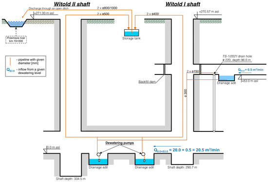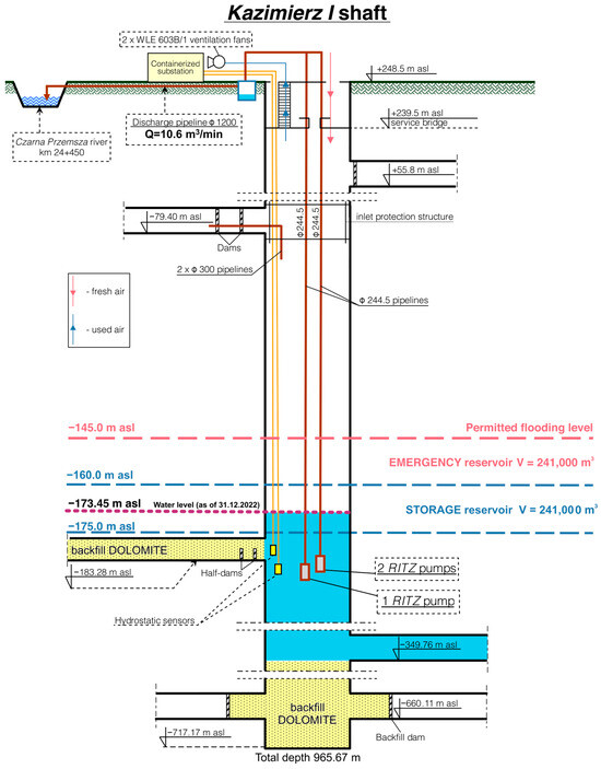 The DPS requires a shaft adapted into a pumping well with at least two completely submerged pumps, keeping the water level below dangerous connections between mines (Figure 5). According to the regulations in Poland, the DPS must guarantee pumping out the maximum daily inflow in less than 20 h.