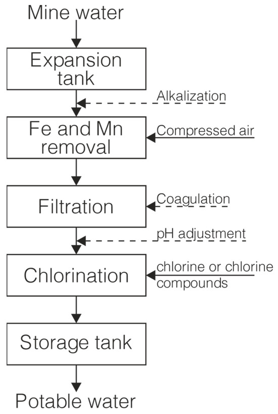The use of water from the Saturn DPS for drinking purposes has already been proposed by Sawiniak and Kłos [9]. They showed that water from dewatering can be a cost-effective and quality water source, with simple water treatment technology (Figure 9). Tests of water treatment technology at the Saturn DPS showed that the concentration of iron decreased to less than 0.1 mg/L, and the concentration of manganese to less than 0.05 mg/L.
