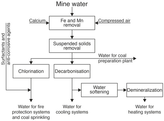 Industrial water (Group II) almost always requires the removal of iron and manganese, followed by the removal of suspended solids [33]. A further treatment process depends on the intended water use. For example, industrial water used for fire protection and coal sprinkling in coal mines must be chlorinated. Water for the power plants’ cooling systems must be decarbonized with lime, and water intended for use in heat distribution networks must be softened and demineralized (Figure 8).