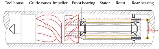 The outer diameter of the DHTG’s casing is constrained by the external dimensions of the tool, requiring the rotor structure to be designed as a slender rod, as shown in Figure 1. The rotor-bearing system(RBS) of the DHTG is subjected to complex internal and external excitation, including hydraulic and electromagnetic excitation. Simultaneously, manufacturing defects in rotating components, material irregularities, and the challenging working environment of the generator contribute to an inevitable mass unbalance along the rotor. Under the influence of complex internal and external excitation, the bearings experience additional dynamic loads. The generator’s lifespan is deeply rooted in these loads. Therefore, a detailed analysis of the dynamic characteristics of the rotor system under drill-string excitation must be conducted to increase the generator’s lifespan and prevent catastrophic failures during operation.