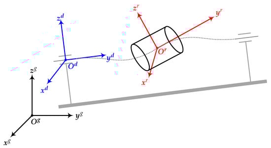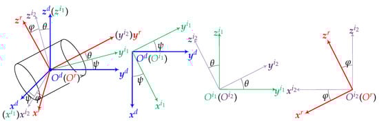 Similarly, let be obtained by rotating in the order of and with angles of . The coordinate transformation matrix is denoted by , whose expression could be obtained by replacing the angles , , and in Equation (2) with , , and . Finally, the angular velocity of to , denoted as , can be calculated by []. Based on the transport theorem, the time derivate of in , and can be related by