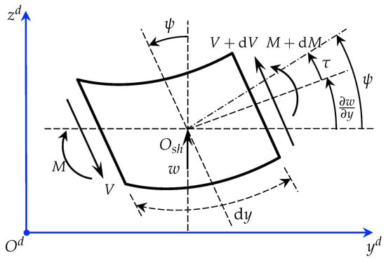 The displacement inside the element is interpolated by the shape function. The Timoshenko beam theory is employed to describe the shaft deformation. This beam theory, built upon the Euler–Bernoulli beam theory, takes into account the influence of shear force V on the flexural deformation, as shown in Figure 4. From the geometry relationship, one has . Then, the differential equation of beam deflection can be expressed as