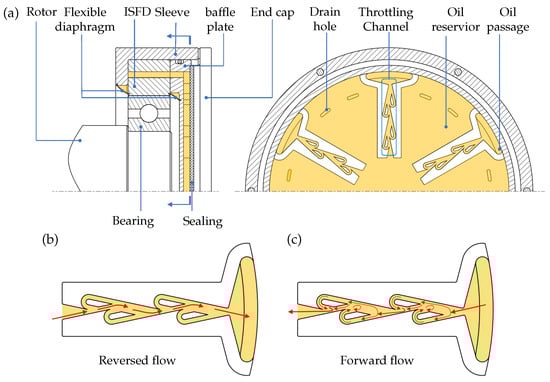 The throttling passage is connected to the circumferential oil films through the arc-shaped oil passage. When an oil film is squeezed, the oil flows in the forward direction via the oil passage and throttling channel to the oil reservoir. When the circumferential oil film expands, the oil flows in the reverse direction. The throttling channel has a Tesla valve structure, and hence it induces significant resistance during the forward flow, as shown in Figure 5c. However, the oil flows smoothly and the resistance is smaller during the reversed flow, as shown in Figure 5b. Since the SFD alleviates the damping dependence solely on the circumferential oil film, it allows a thicker oil film without sacrificing the damping characteristics. Therefore, it can run over a wider amplitude range. The low resistance during the reversed flow also helps to alleviate the oil film cavitation, thus enhancing the oil film stability.