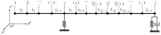 The discrete dynamic model of the RBS is illustrated in Figure 7. Here, we simplify the turbine action to a predefined rotation input of the rotor. The rotor shaft is stepped two and equidistantly discretized by j nodes, with the front bearing, rear bearing/SFD, and MU located at node i, j, and , respectively. The shaft is stepped at the node i. The obtained matrices and vectors for the shaft, MU, and roller bearings/SFD are assembled appropriately. The systematic motion equation for the RBS under drill-string excitation is