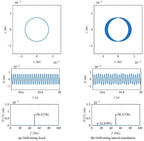 Figure 8a shows the case where the drill-string is fixed. The amplitude and period of time waveform in x and z directions are the same, with different initial phases, and the lateral responses maintain isotropy. The corresponding whirl orbit is a circular path, indicating synchronous periodic motion. The FFT spectrum only shows the rotational frequency . Figure 8b depicts the case of the drill-string under x-direction translation, with the excitation form , where the amplitude is and translational frequency is . The whirl orbit shows a circular shape spreading in x direction, and the whirl orbit remains symmetric in x and z directions. The FFT spectrum exhibits the translational frequency component , but the spin frequency component predominates.