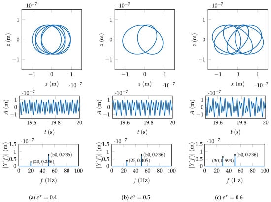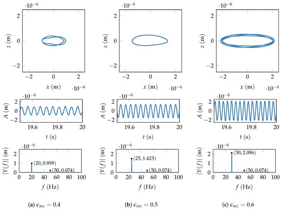 When , as shown in Figure 9a, the shape of the whirl orbit is formed by overlapping circular translations in x direction (direction of excitation), with an increased translation amplitude compared to . When , the whirl orbit becomes quite special. At this point, the spin frequency of the rotor is an integer multiple of the drill-string’s translational frequency. As shown in Figure 9b, the whirl orbit is no longer circular, and it resembles two partially overlapping ellipses. When increases to 0.6, the corresponding whirl orbit transforms into a complex shape, as shown in Figure 9c, resembling several ellipses with z direction as the axis of symmetry, rotating at different angles in the plane. The x-direction displacement response is highly sensitive to changes in the translational frequency of the drill-string, while the corresponding z-direction displacement response is almost unaffected. The shape of the whirl orbit undergoes significant changes, while the range of the whirl orbit (especially in the z direction) does not change significantly. In all three cases, the whirl orbit does not strictly maintain symmetry in the z direction, which is due to the initial phase caused by the presence of MU. As increases from 0.4 to 0.6, the higher drill-string translational frequency exacerbates the asymmetry phenomenon. During this process, the frequency component of the drill-string’s excitation in the FFT spectrum gradually increases.