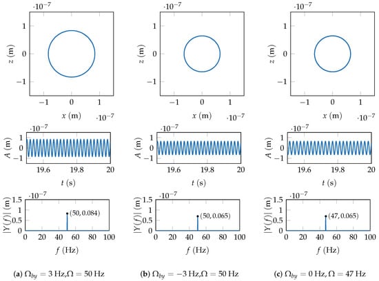 Changing the excitation form to lateral oscillation, the oscillation amplitude is around the z direction , where is the maximum oscillation amplitude, and is the oscillation frequency. Similar to the lateral translation study, using the control variable method, keep constant at and change . Analyze the change of the whirl orbit. Let represent the proportional relationship between the lateral oscillation frequency of the drill-string and the rotor’s spin frequency. Figure 10 shows the displacement responses under the excitation of lateral oscillation of the drill string.