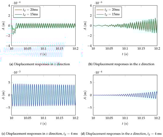 Further reducing to , the impulse duration becomes less than the system’s natural vibration period. The vibration response is depicted in Figure 12c,d. The displacement response in the x direction does not immediately decay after the impulse disappears; instead, it gradually decreases over time. Simultaneously, both the x and z-direction displacement responses exhibit a significant increase in amplitude. This phenomenon arises from the short impulse duration causing the excitation to be distributed in a narrower frequency range, concentrating more on frequencies that match the system’s natural frequency. The resonance effect intensifies, allowing the system to absorb sufficient energy, resulting in sustained vibrations after the impulse concludes. This implies that, to enhance the rotor system’s resistance to impulse excitation, it is advisable to increase the system’s natural vibration period. Moreover, it is crucial to ensure that the pulse excitation duration during operational conditions exceeds the system’s natural vibration period.