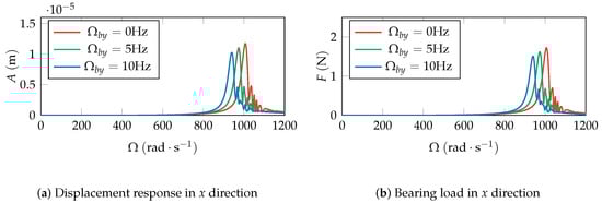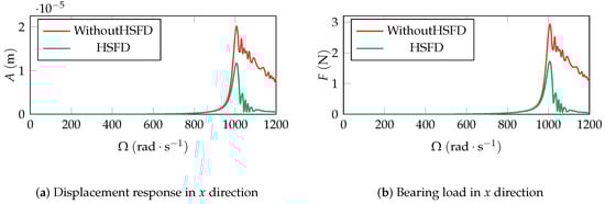 Taking the results of the fixed drill-string as reference, changing the form of the drill-string excitation, the displacement response, and bearing load variation of the system with SFD installation is studied. Considering the drill-string rotates axially, the rotational direction of drill-string is identical to that of the rotor shaft. The displacement response at node 9 and the bearing load at node 13 are analyzed for the x direction only, as it does not change the lateral isotropy of the shaft. When the axial rotation angular velocity of the drill-string increases from to , the displacement response and bearing load are shown in Figure 14. Compared with the drill-string fixed case, the critical speed of the system slightly decreases, as the angular velocity increases, and the peak value of the displacement response correspondingly decreases. At the same time, the peak value of the corresponding bearing load also decreases, maintaining a consistent trend with the change in the peak value of the displacement response.