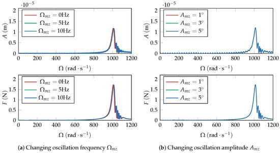 Unlike lateral translation and lateral oscillation excitations, the frequency of the drill-string’s axial rotation does not appear in the FFT spectrum. However, it affects the amplitude of the rotor’s spin frequency in the spectrum. In terms of the effect, it is like the superposition of the spin frequency and the excitation frequency. When the excitation is , its effect is very similar to that of the spin frequency . Although the frequencies are different in the spectrum, the amplitudes are approximately equal.