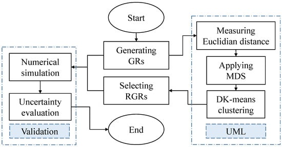 In this work, the RGR selection process is based on the optimal UML algorithm detailed by Mahjour and Faroughi [30], encompassing the measurement of the Euclidean distance, MDS, and the DK-means clustering. As shown in Figure 1, the workflow begins with the generation of numerous GRs while considering uncertainties. To evaluate the UML framework’s effectiveness, both the full and RGR sets undergo examination using CMG-GEM (Canada Modeling Group-Generalized Equation of State Model). Consequently, we compare the distributions of simulation outputs obtained from the RGRs with those originating from the full set.