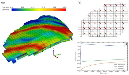 We delve into the physics underlying migration and extract three simulation outputs—(i) structural trapping, (ii) residual trapping, and (iii) solubility trapping—using CMG-GEM. In the solubility trapping simulation, we take into account the chemical interactions between the gaseous and aqueous phases [57]. However, mineral trapping is excluded from our study, as it predominantly occurs after 1000 years, whereas our simulation duration spans 200 years with 10 years of injection. The simulation output of the reference model is depicted in Figure 3c.