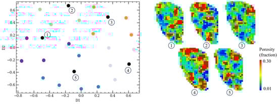Figure 5 displays a 2D map showing all the realizations obtained through the Euclidean/MDS/DK-means approach with five clusters. The MDS algorithm positions these realizations on a 2D map while preserving their distances based on Euclidean measurements in a distance matrix. Subsequently, the DK-means algorithm groups the realizations into multiple clusters. Using the centroid sampling method, one realization is selected as a representative of each cluster. The black points on the 2D map represent these five representative realizations. Upon visual examination, it is evident that the representative realizations are evenly distributed across all the models.