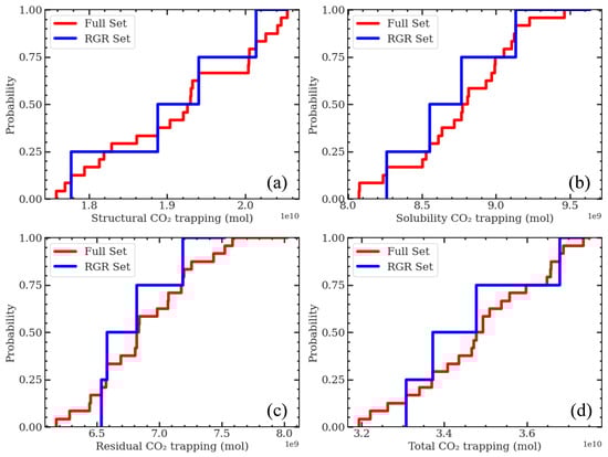 Comparison of CDFs between RGRs and the full set for trapping mechanisms. The values for (a) structural, (b) residual, (c) solubility, and (d) total trapping are 0.20, 0.24, 0.16, and 0.24, respectively. The average is 0.21, which is lower than , 0.66, indicating a close similarity in the distribution patterns of trapping mechanisms between the RGRs and the entire set of 25 GRs.