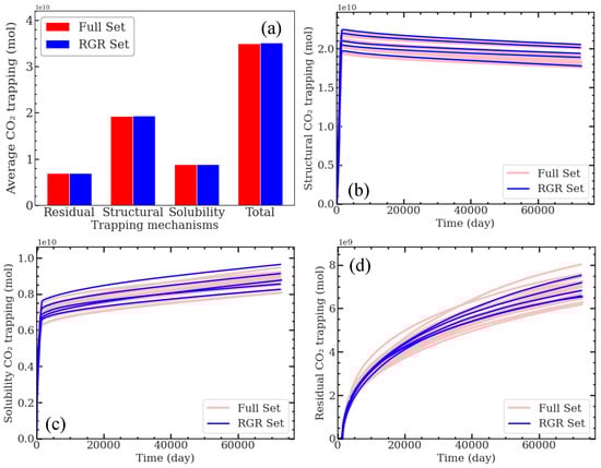 Statistical analysis of trapping mechanisms between RGRs and the full set. Panel (a) compares the average of trapping mechanisms between RGRs and the full set. The average values obtained from the RGRs— for residual trapping, for structural trapping, for solubility trapping, and for total trapping—closely align with those derived from the full set (, , , and , respectively). Panels (b–d) show the time series curves of structural, residual, and solubility trapping, respectively, for both RGRs and the full set. The comparison validates the RGRs’ representation of the full-set results, confirming their reliability in simulating trapping mechanisms.