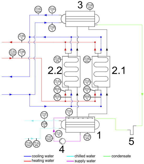 The investigated adsorption chiller, a diagram of which is shown in Figure 2, is equipped with an evaporator (1), bed number 1 (2.1), bed number 2 (2.2), a condenser (3), a pump (4), and a U-tube (5).