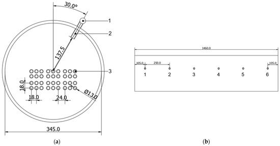 (a) Cross-section of the evaporator: 1—manifold; 2—nozzle; 3—coil with chilled water; (b) side view of the evaporator (dimensions are in mm).