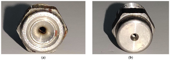 Two types of nozzles can be used interchangeably in the investigated adsorption chiller—type 1 nozzles (Figure 5a) and type 2 nozzles (Figure 5b). The difference between these two types of nozzles is the spray angle; the spray angles of type 1 and type 2 nozzles are 120° and 90°, respectively. The flow rate of water through the nozzle as a function of water pressure is summarized in Table 3.