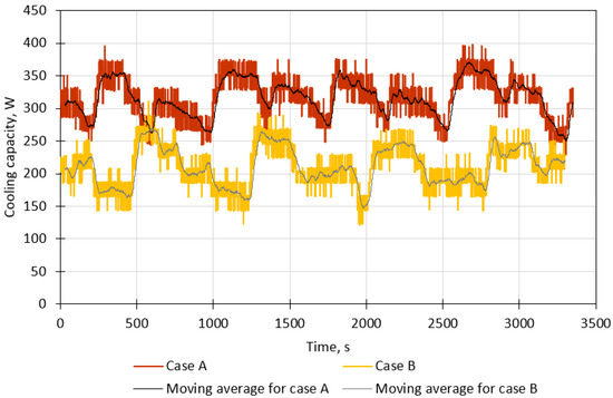 The cooling capacity of the adsorption chiller with six type 1 nozzles (case A) and six type 2 nozzles (case B) and a total flow rate of water through the nozzles of 400 L/h is shown in Figure 6. As can be seen, the cooling capacity for case A varies from about 250 W to 375 W (average value of 316 W, standard deviation of 31 W), while the cooling capacity for case B varies from about 150 W to 300 W (average value of 210 W, standard deviation of 32 W). Therefore, in the analyzed case, a higher spray angle is better in the context of the cooling capacity of the adsorption chiller. Water evaporation is a very complicated process, and it depends on many factors. The observed increase in cooling capacity for the greater spray angle (120°) can be attributed to the following reasons. Firstly, increasing the spray angle can reduce the droplet size and improve the uniformity of droplets, which has a positive effect on evaporation performance [26]. Secondly, with a greater spray angle, the water droplets fall on a larger surface area of the tube, from which they receive heat. It must be remembered that the evaporation rate is proportional to the free surface area of the evaporating liquid. Additionally, according to Dai et al. [27], the thickness and flow mode of a falling film have a significant impact on the overall heat transfer coefficient between the tube and the falling film. Thus, the possibility cannot be excluded that the spray angle affects the falling film’s thickness and flow mode, which results in an improved heat transfer coefficient, a faster evaporator, and greater cooling capacity.