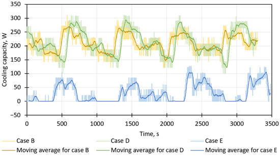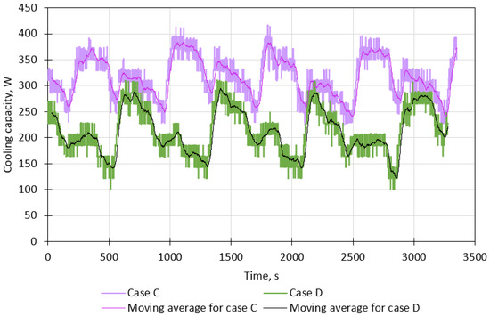 Figure 7 presents the cooling capacity of the adsorption chiller with six type 1 nozzles (case C) and six type 2 nozzles (case D) and a total flow rate of water through the nozzles of 200 L/h. The cooling capacity for case C varies from about 225 W to 425 W (average value of 319 W, standard deviation of 41 W). The cooling capacity for case D varies from about 100 W to 325 W (average value of 211 W, standard deviation of 44 W). Comparing the results for water flow rates of 400 L/h (cases A and B) and 200 L/h (cases C and D), it can be concluded that the average cooling capacity is similar for both water flow rates. However, the cooling capacity in the case of a lower water flow rate, i.e., 200 L/h, is more unstable, which is evidenced by a greater standard deviation value.