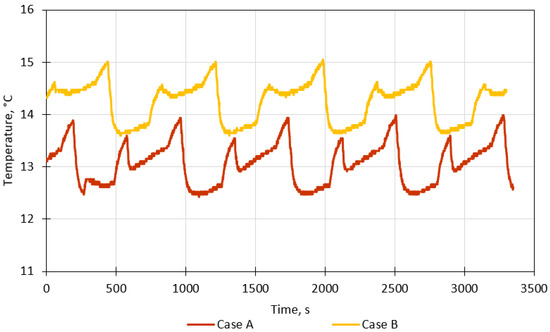 The temperature inside the evaporator for a 400 L/h water flow rate and six type 1 nozzles (case A) and six type 2 nozzles (case B) is shown in Figure 8. In case A, the temperature inside the evaporator varies from about 12.5 °C to 14.0 °C (average of 13.06 °C, standard deviation of 0.40 °C). On the other hand, the temperature inside the evaporator in case B fluctuates between 13.5 °C and 15.0 °C (average of 14.24 °C, standard deviation of 0.39 °C). Therefore, a greater spray angle results in a slightly lower temperature inside the evaporator because the water droplets are sprayed on a greater surface area, and thus, the evaporation rate is higher, as it is proportional to the surface area.