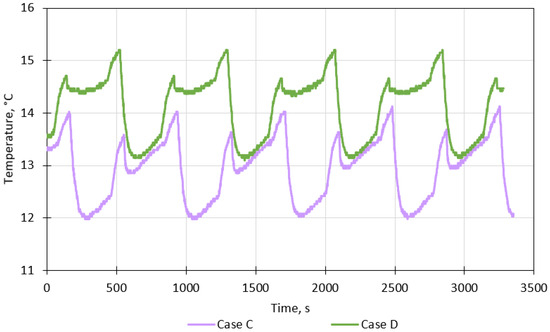 Figure 9 shows the temperature inside the evaporator for a water flow rate of 200 L/h and two types of nozzles. The temperature inside the evaporator for type 1 nozzles (case C) varies from approximately 12.0 °C to 14.0 °C (average of 12.91 °C, standard deviation of 0.61 °C), while the changes for type 2 nozzles (case D) are from about 13.2 °C to 15.2 °C (average of 14.12 °C, standard deviation of 0.60 °C). Therefore, using type 1 nozzles results in a lower temperature inside the evaporator than using type 2 nozzles. Additionally, comparing the results obtained for the water flow rates of 400 L/h (cases A and B) and 200 L/h (cases C and D), one can say that in both cases, nozzles with a greater spray angle provide a lower average temperature inside the evaporator. However, the operation of the evaporator is more unstable when the water flow rate is lower, which is evidenced by a higher standard deviation value.