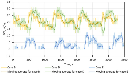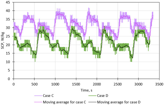 Figure 11 presents the SCP for a water flow rate of 200 L/h and two types of nozzles. The SCP is greater for type 1 nozzles (case C), falling within the range of 25–42 W/kg, than for type 2 nozzles (case D), falling within the range of 10–33 W/kg. Furthermore, the average SCP and its standard deviation in case C are 31.9 W/kg and 4.1 W/kg, respectively. In case D, the average SCP and its standard deviation are 21.1 W/kg and 4.4 W/kg, respectively. Comparing the results achieved for 400 L/h (cases A and B) and 200 L/h (cases C and D), the average SCP is almost the same, while the standard deviation is greater for a water flow rate of 200 L/h, which indicates more unstable operation of the evaporator.